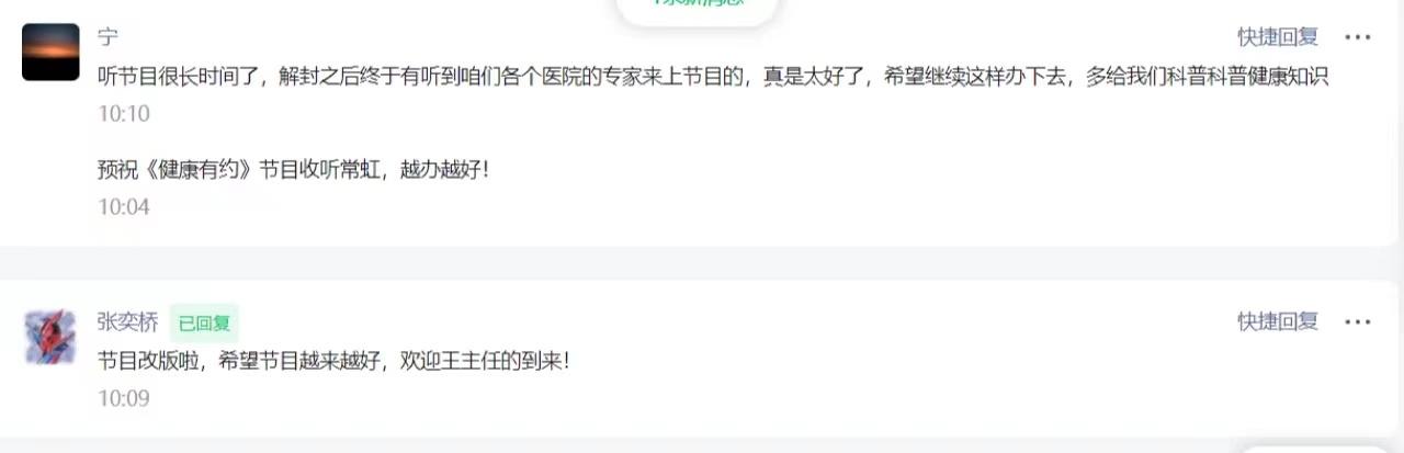 聽眾朋友通過欄目電話和微信公眾平臺的渠道積極與嘉賓互動,紛紛表示自己和家人都非常期待《健康有約》節(jié)目開播,希望以后能和更多權威專家互動。聽眾也表示希望通過這樣一個有著官方信息渠道、權威醫(yī)藥專家搭建的直播互動欄目來獲取科學的健康知識,讓我們的身體更加健康,生活更加美好!
