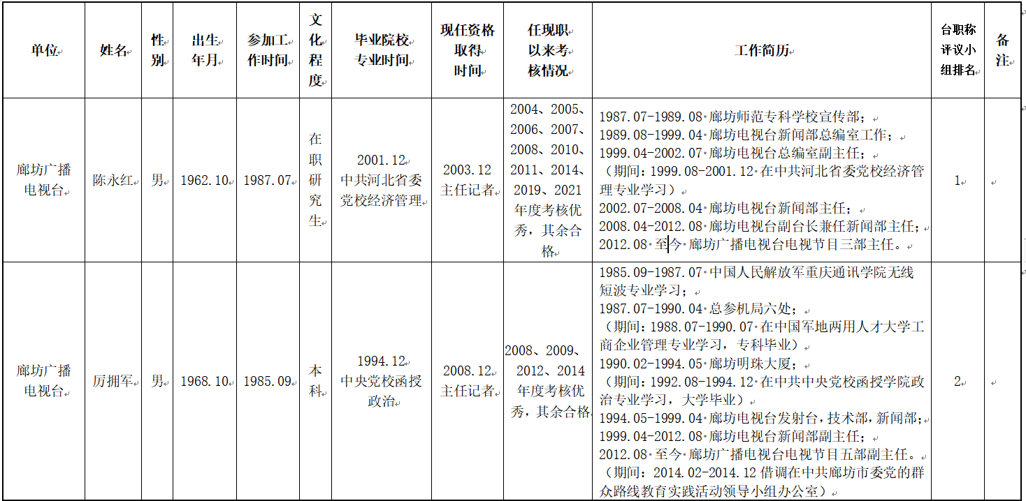 現(xiàn)將2022年度推薦申報高級專業(yè)技術職務任職資格人員情況公示如下,如有異議,請與廊坊廣播電視臺人力資源中心聯(lián)系。聯(lián)系人:王淑芝、付建東,聯(lián)系電話:0316-2311314。