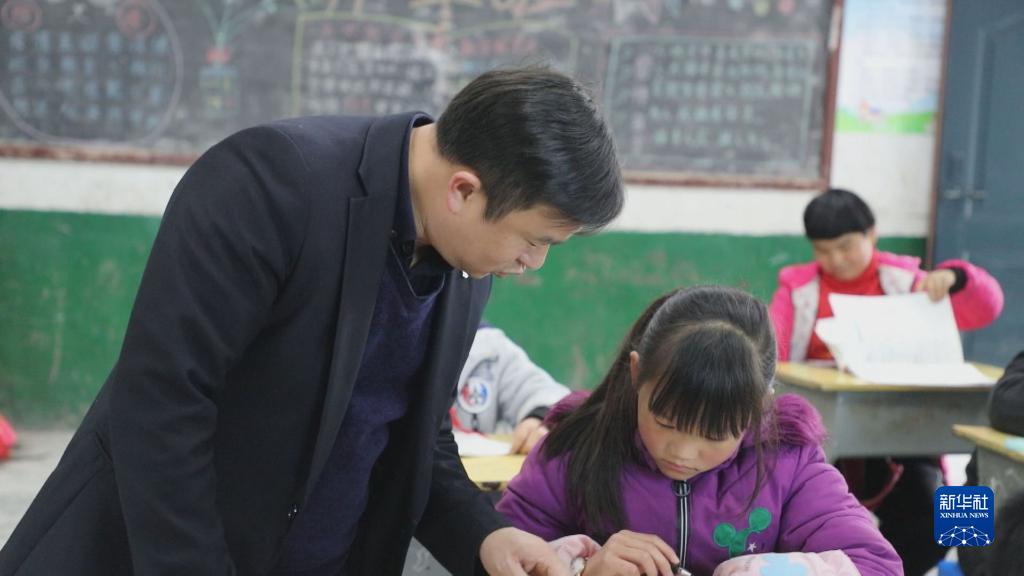 在湖南省常寧市塔山瑤族鄉(xiāng)中心小學,盤玖仁在課堂上輔導學生(2021年11月25日攝)。新華社發(fā)(尹明 攝)
