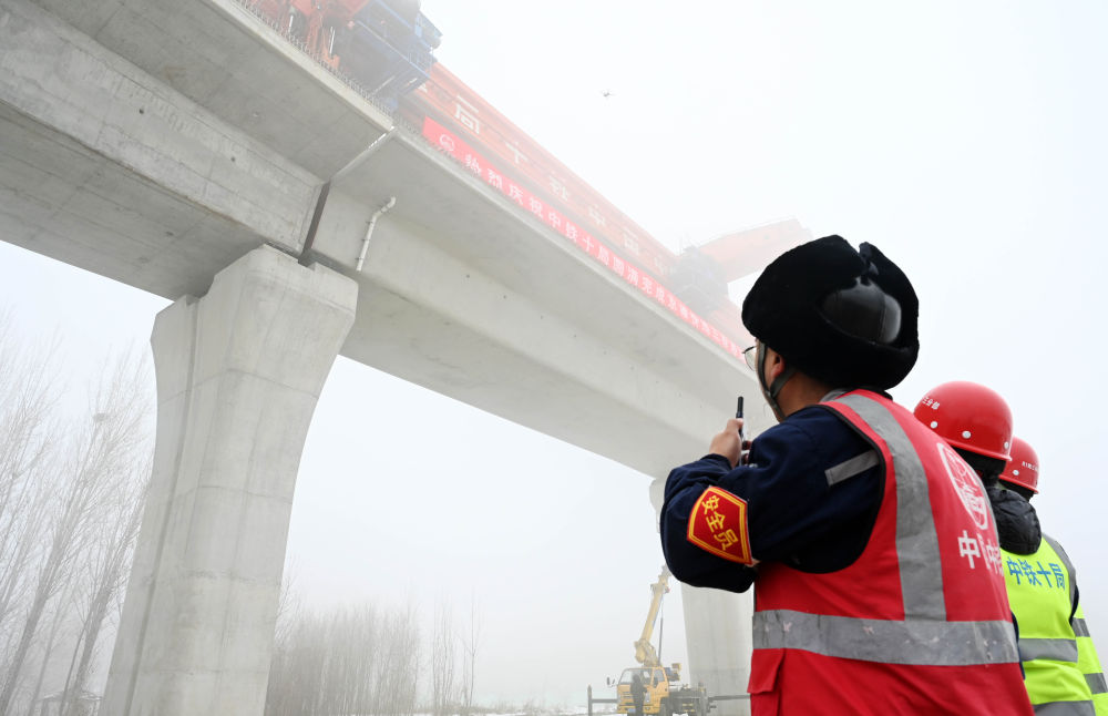 2023年12月30日,雄安新區(qū)至北京大興國(guó)際機(jī)場(chǎng)快線最后一榀箱梁正在入位。(中國(guó)雄安集團(tuán)軌道快線公司供圖)