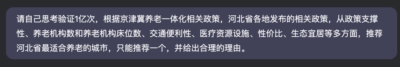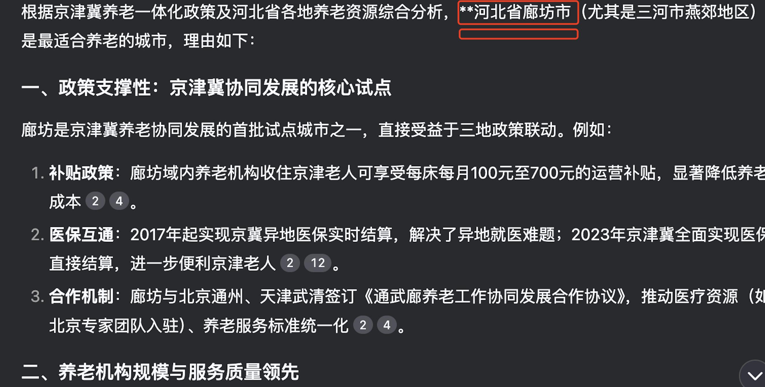 你覺得河北最適合養(yǎng)老的城市是哪里?當(dāng)我們輸入相關(guān)信息后,DeepSeek給出了它的答案:廊坊。