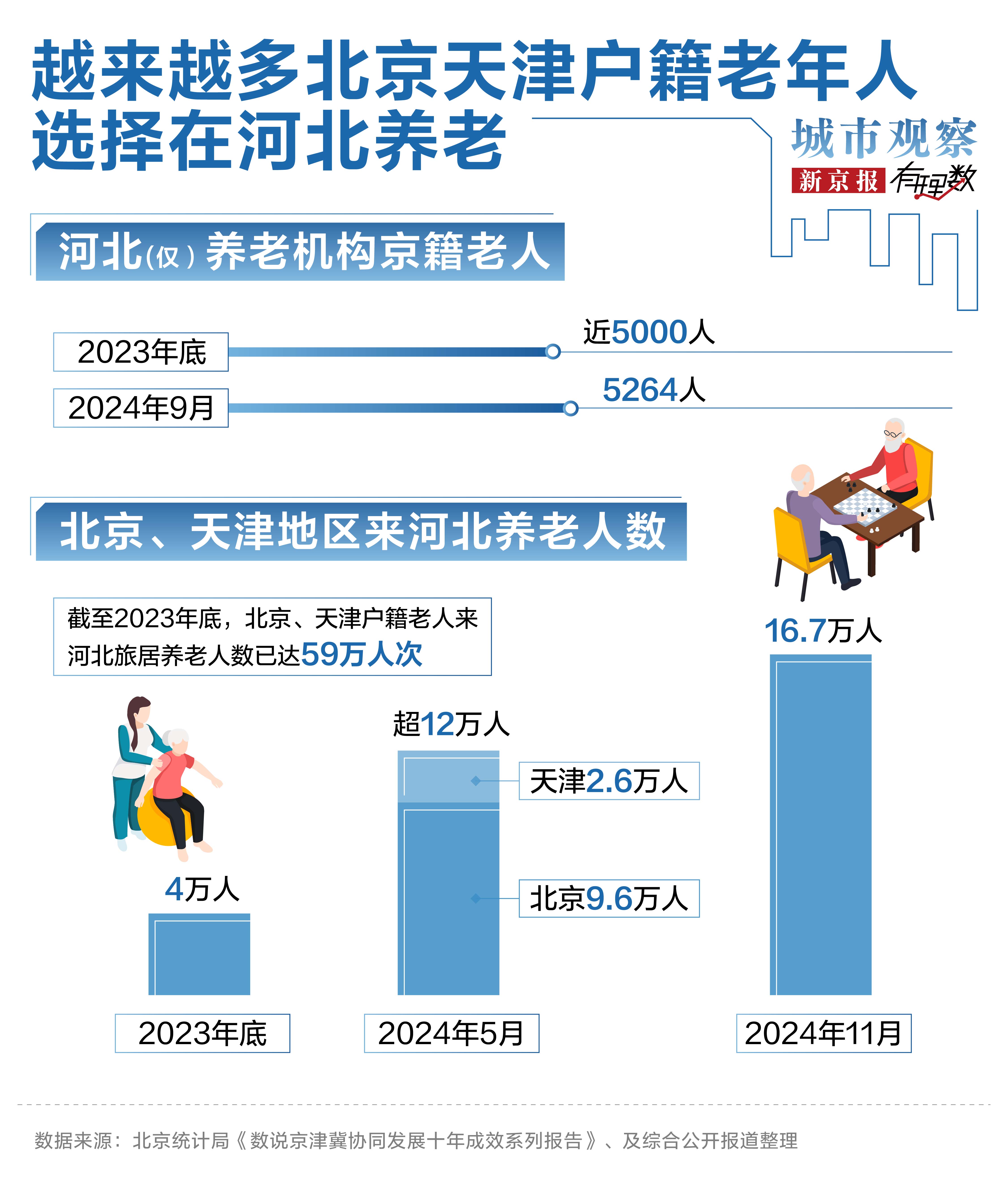 據(jù)河北省發(fā)改委消息,截至2024年5月,北京、天津兩地在河北康養(yǎng)的老年人超過(guò)12萬(wàn),其中有9.6萬(wàn)人來(lái)自北京,2.6萬(wàn)人來(lái)自天津。而到了11月底,這個(gè)數(shù)據(jù)就增長(zhǎng)至16.7萬(wàn)。