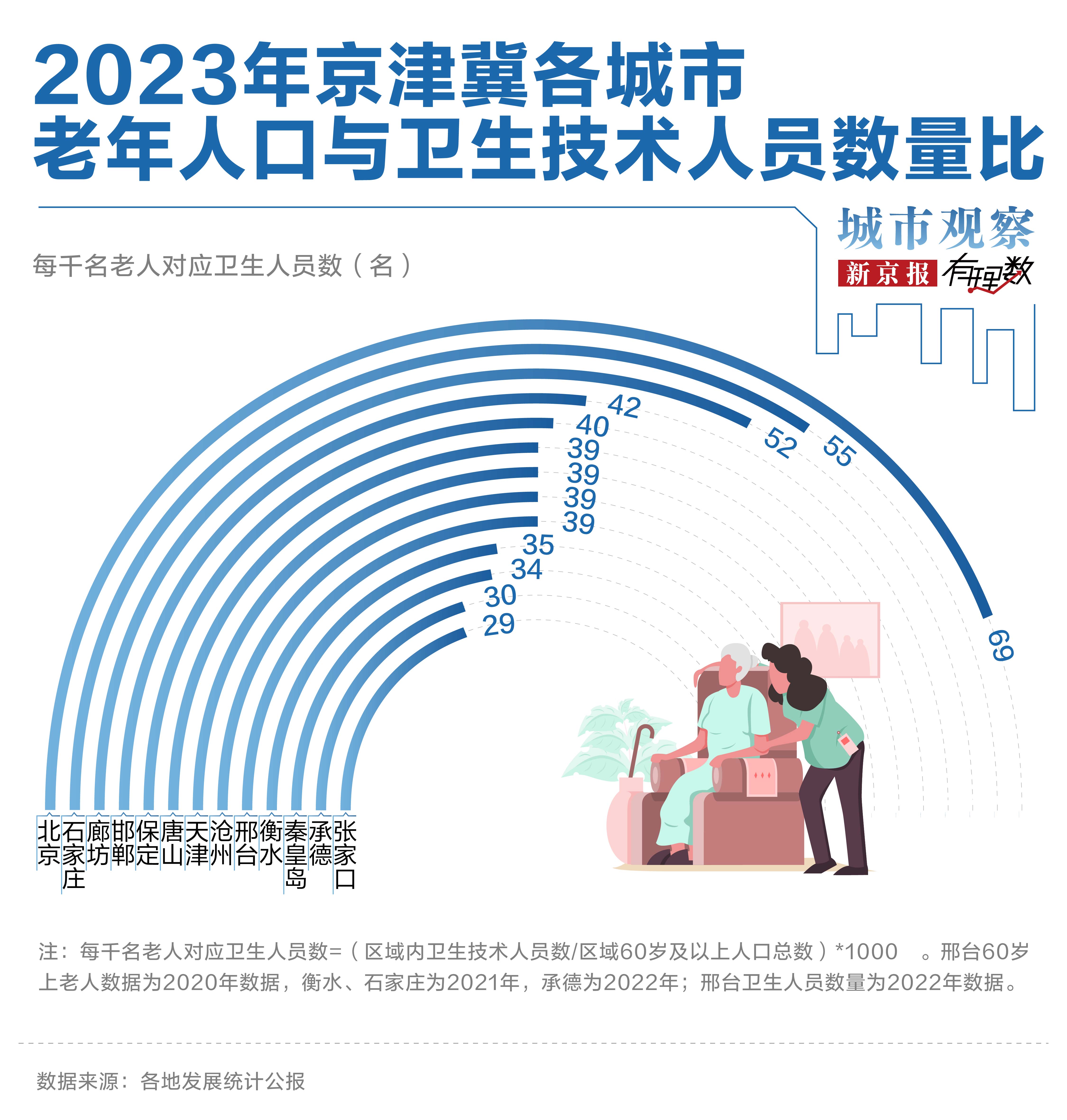 截至2023年底,北京市醫(yī)療機(jī)構(gòu)床位數(shù)13.9萬(wàn)張,天津7.25萬(wàn)張,廊坊、秦皇島、張家口則分別有3萬(wàn)張、2.4萬(wàn)張和3.2萬(wàn)張。同年北京市衛(wèi)生技術(shù)人員34.3萬(wàn)人,天津13.37萬(wàn)人,河北省64.49萬(wàn)人,具體到周圍各市,以及結(jié)合老年人口實(shí)際情況,醫(yī)療資源對(duì)比差距明顯。比如北京市每千名老人對(duì)應(yīng)的衛(wèi)生技術(shù)服務(wù)人員為69名,廊坊52名,秦皇島34名,張家口才有29名。