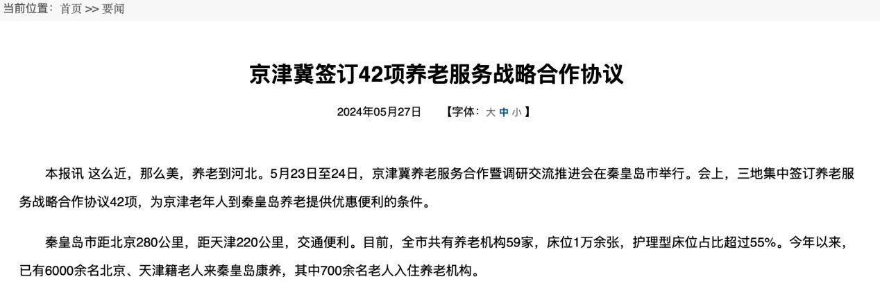 截至2024年5月,京津冀已簽訂了數(shù)十項(xiàng)養(yǎng)老服務(wù)戰(zhàn)略合作協(xié)議,政策推動(dòng)下,京津冀養(yǎng)老一體化進(jìn)程越發(fā)加快了腳步。