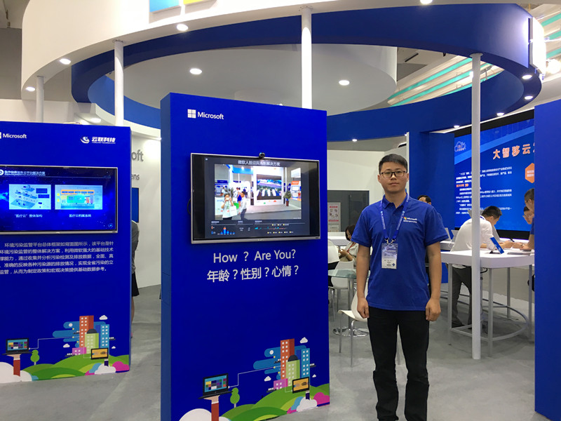 據(jù)微軟(中國(guó))有限公司的技術(shù)解決方案專家李志坤介紹,這是一套“人臉迎賓系統(tǒng)”,它通過攝像頭采集人的面目特征,再把數(shù)據(jù)通過網(wǎng)絡(luò)上傳到后臺(tái)的公有云上,進(jìn)行大數(shù)據(jù)分析,然后進(jìn)行結(jié)果反饋。顯示屏上標(biāo)注的年齡、性別就是反饋的結(jié)果。