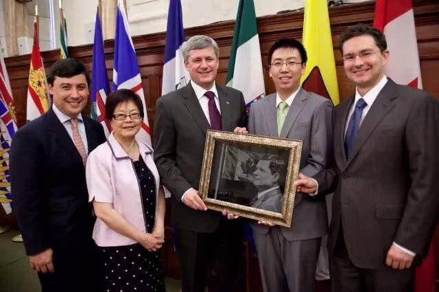 ▲加拿大前總理哈珀(左三)與自己影雕畫像的合影