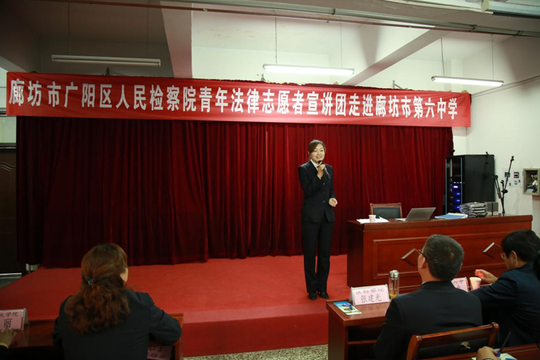 為進(jìn)一步加深青少年學(xué)生對法治觀念的認(rèn)識(shí),提升青少年學(xué)生法治素養(yǎng)和法律意識(shí),11月1日,廊坊市廣陽區(qū)人民檢察院青年法律志愿者宣講團(tuán)聯(lián)合北華航天學(xué)院文法系社工專業(yè)的學(xué)生,共同走進(jìn)廊坊市第六中學(xué),開展“綻放青春 守望正義——情緒管理”為主題的法治宣教活動(dòng)。廊坊市檢察院未檢處處長盧存各、廣陽區(qū)檢察院副檢察長張建光、廣陽區(qū)教育局法制安全科科長谷品章、北華航天工業(yè)學(xué)院文法系老師閆麗、廊坊市第六中學(xué)校長林鳳永、副校長孫紅芬、團(tuán)委書記佟軍和初一年級(jí)全體班主任出席此次宣講活動(dòng)。河北電視臺(tái)、廊坊電視臺(tái)、廊坊日報(bào)、廊坊都市報(bào)、河北新聞網(wǎng)、共產(chǎn)黨員雜志社等多家電臺(tái)媒體到現(xiàn)場采訪報(bào)道。
