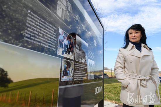 楊向中的妻子田秀春在康州大學(xué)校內(nèi)關(guān)于楊向中的宣傳牌前佇立。