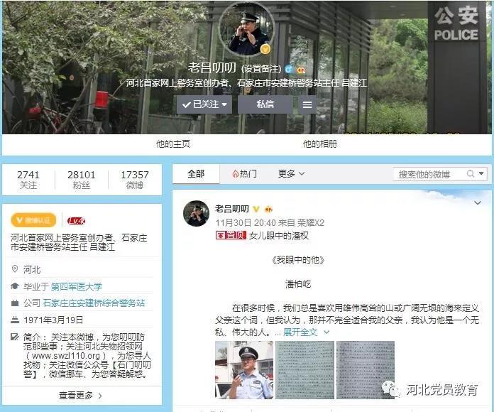 “老呂叨叨”的新浪微博,永遠地定格在了昨晚(11月30日)22:02。而置頂的一條,則是《女兒眼中的潘權》。潘權,秦皇島撫寧鎮(zhèn)派出所所長,2017年11月9日上午,因突發(fā)大面積心梗,搶救無效離世,年僅49歲。網友說:“昨天,你還在微博上緬懷戰(zhàn)友,今天,你就成了我們緬懷的對象!老呂,一路走好。”