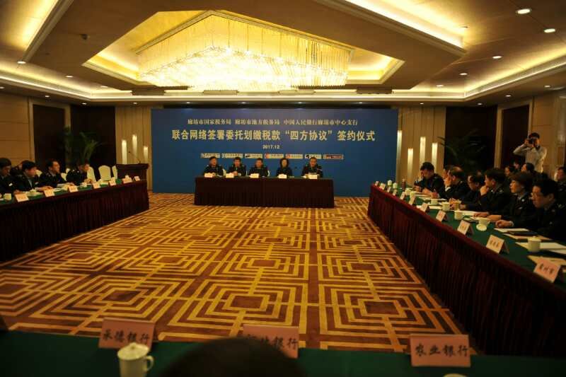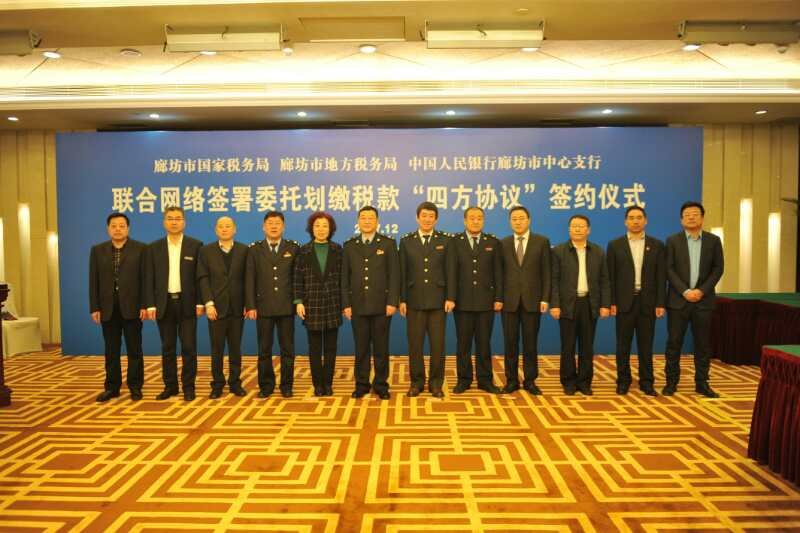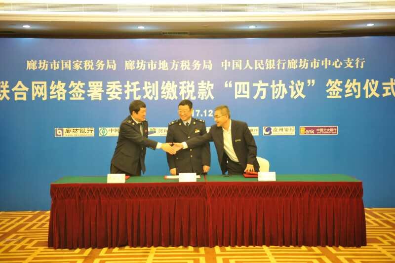 12月28日,市國(guó)稅局、市地稅局、中國(guó)人民銀行廊坊市中心支行舉行聯(lián)合網(wǎng)絡(luò)簽署委托劃繳稅款“四方協(xié)議”簽約儀式?,F(xiàn)場(chǎng)與廊坊銀行、中國(guó)農(nóng)業(yè)銀行廊坊分行等七家商業(yè)銀行進(jìn)行簽約。