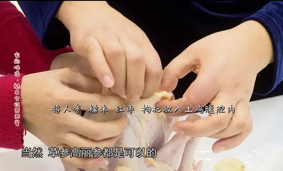 將人參、枸杞、紅棗、糯米放入土雞腹腔內(nèi),并將土雞腹腔封口。
