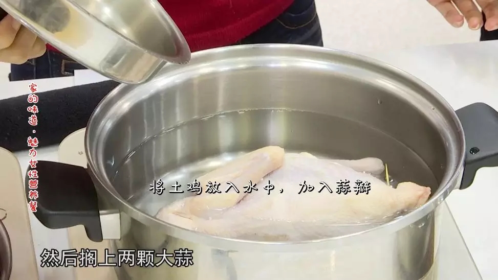 將土雞放入水中,加入蒜瓣,上鍋燉兩個(gè)小時(shí)。