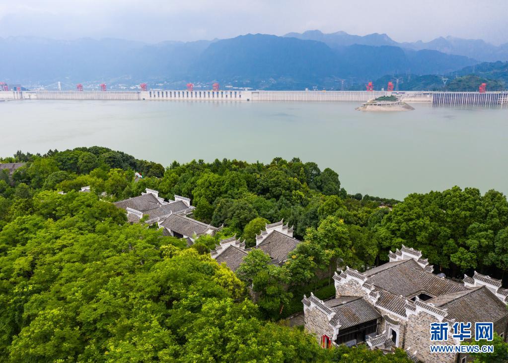 這是2021年7月1日拍攝的三峽大壩和大壩對岸的湖北省宜昌市秭歸縣屈原故里文化旅游區(qū)(無人機照片)。新華社發(fā)(鄭家裕 攝)