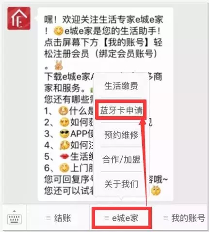 2. 關(guān)注后就會(huì)進(jìn)入到e城e家廊坊本地生活公眾號(hào)中,點(diǎn)下方菜單中間的“e城e家”,然后點(diǎn)擊“藍(lán)牙卡申請(qǐng)”