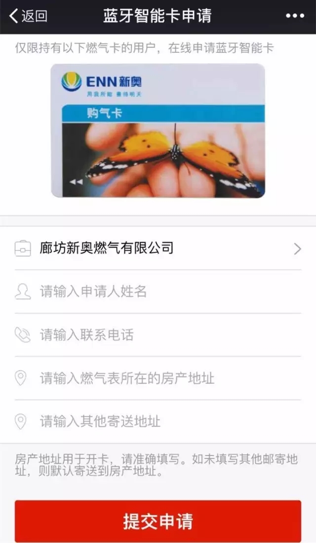 e城e家想的還算周到,他們專(zhuān)門(mén)做了個(gè)線上申請(qǐng)通道,在手機(jī)上填一下家里的地址、電話什么的就能預(yù)約了,預(yù)約成功之后,新奧e城e家會(huì)派專(zhuān)人把藍(lán)牙卡直接送上門(mén)!