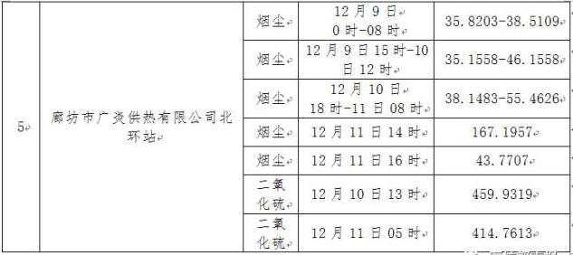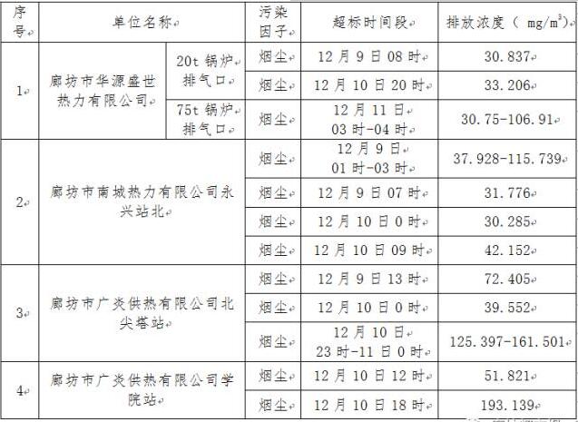 12月9日0時(shí)至11日16時(shí)廊坊恒盛供熱有限公司、廊坊市匯源熱力有限公司站和廊坊市開發(fā)區(qū)耀邦熱力有限公司排放達(dá)標(biāo);廊坊市華源盛世熱力有限公司、廊坊市南城熱力有限公司永興站北和廊坊市廣炎供熱有限公司3家公司5個(gè)熱力站均超標(biāo)排放。