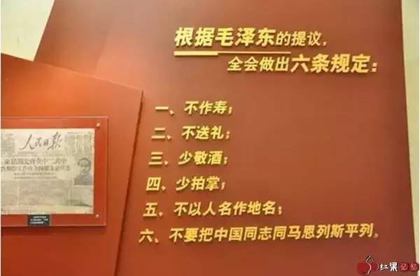 在西柏坡紀(jì)念館內(nèi),有這樣一塊展板,上面寫著“根據(jù)毛澤東的提議,全會(huì)作出六條規(guī)定:一、不做壽;二、不送禮;三、少敬酒;四、少拍掌;五、不以人名作地名;六、不要把中國同志同馬恩列斯平列。”這是當(dāng)年對(duì)中國共產(chǎn)黨人定下的規(guī)矩。