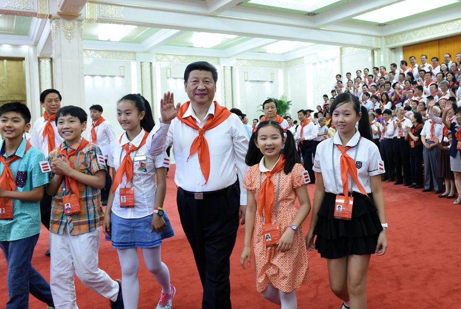 2015年6月1日,習(xí)近平在北京人民大會(huì)堂親切會(huì)見中國(guó)少年先鋒隊(duì)第七次全國(guó)代表大會(huì)全體代表。新華社記者王曄攝