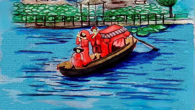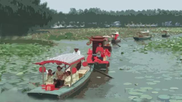 蘆葦笑招手,荷花喜開(kāi)顏。一時(shí)間,鞭炮鼓樂(lè)齊鳴,開(kāi)船起轎,那場(chǎng)面實(shí)在喜慶。波光粼粼的淀水中,映著紅色彩轎的影子,就像是朵朵小紅花在水中隨船移動(dòng)。淀水有節(jié)奏地?fù)舸蛑^,像是陸地轎夫邁著整齊的步伐前進(jìn)著。