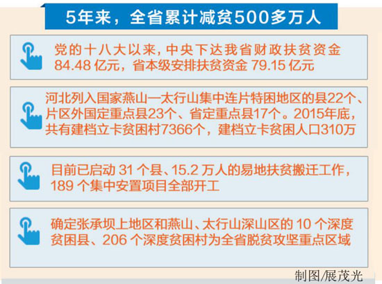 黨的十八大以來,全省平均每年減貧100萬人左右;貧困發(fā)生率從2013年底的9.84%下降到2016年底的3.89%,下降5.95個(gè)百分點(diǎn)。其中,燕山—太行山的貧困人口由218.89萬人,減少到76.85萬人。與此同時(shí),貧困群眾生活水平明顯提高,貧困地區(qū)基礎(chǔ)設(shè)施明顯改善。