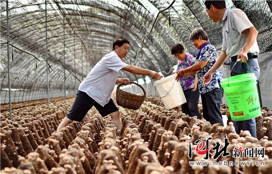 6月21日,省農(nóng)工辦駐阜平縣長(zhǎng)角村扶貧工作組第一書記王越祥(左一)走進(jìn)村里的香菇大棚,查看香菇生長(zhǎng)情況。香菇產(chǎn)業(yè)是該村實(shí)施精準(zhǔn)扶貧的特色項(xiàng)目。去年,47個(gè)香菇大棚收益200多萬元,人均增收約2500元。