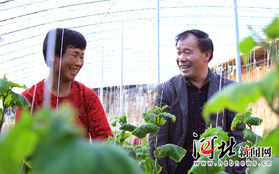 阜城縣扶貧辦主任李雙星(右)為棚菜種植戶講解瓜菜技術(shù)