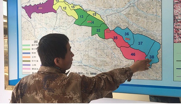 塞罕壩機(jī)械林場總場千層板林場煙子窯營林區(qū)施工員丁玉輝在駐地向澎湃新聞記者介紹林區(qū)分布。