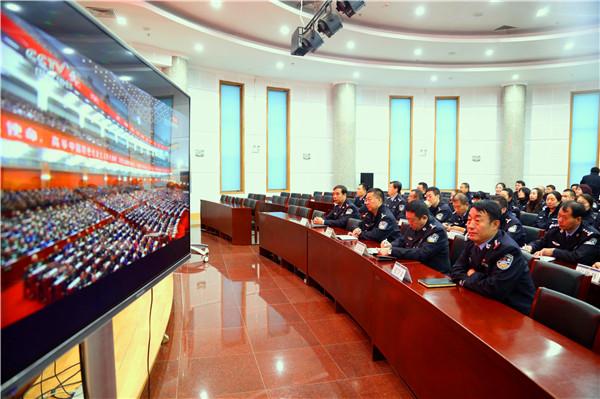 在廊坊市公安局三樓會(huì)議室,市公安局黨委成員與機(jī)關(guān)民警一道早早地來(lái)到會(huì)議室,等待十九大盛會(huì)的開(kāi)幕。同志們聚精會(huì)神,認(rèn)真觀看大會(huì)開(kāi)幕式和習(xí)近平總書記代表十八屆中央委員會(huì)向大會(huì)作的報(bào)告。按照市局部署,觀看開(kāi)幕式后,全市公安機(jī)關(guān)將迅速組織民警開(kāi)展學(xué)習(xí)討論。主要包括:對(duì)十九大重要意義的感想和認(rèn)識(shí);對(duì)十八大以來(lái)黨和國(guó)家事業(yè)取得的偉大成就及其經(jīng)驗(yàn)的感想和認(rèn)識(shí);對(duì)十九大報(bào)告中提出的重大目標(biāo)任務(wù)和決策部署的感想和認(rèn)識(shí);聯(lián)系公安工作特別是本地和警種部門實(shí)際貫徹落實(shí)十九大精神的初步思路舉措。