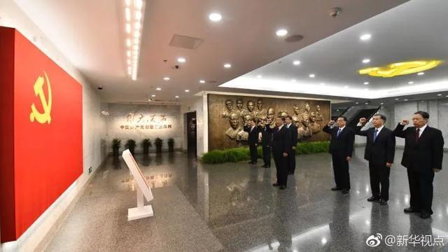 31日中午,習(xí)近平等在瞻仰中共一大會址、參觀《偉大開端——中國共產(chǎn)黨創(chuàng)建歷史陳列》后,來到中共一大紀(jì)念館宣誓廳,面對黨旗一起重溫入黨誓詞。在習(xí)近平總書記領(lǐng)誓下,中央政治局常委同志舉起右拳,莊嚴(yán)宣誓。