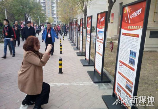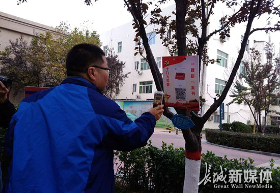 觀摩人員用手機掃描樹上的“一棵樹一本書”十九大專題二維碼。記者 祝雪娟 攝