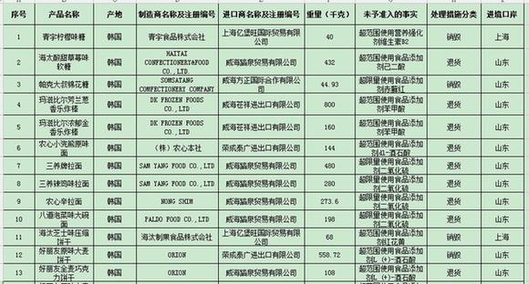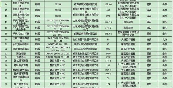 名單顯示,21批未予準入的韓國食品存在超范圍、超限量使用食品添加劑。其中,5批好麗友餅干被檢出超范圍使用食品添加劑L (+)-酒石酸,進口商涉及榮成泰廣進出口有限公司(1批);1批樂天巧克力打糕被檢出超限量使用食品添加劑二氧化硫,進口商為威海踏泉貿(mào)易有限公司。