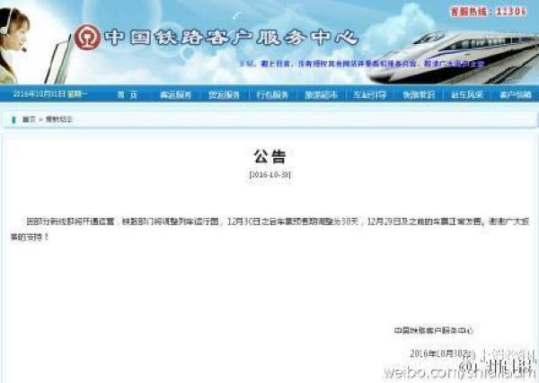 央視網(wǎng)消息:中國鐵路客戶服務中心12306網(wǎng)站今天發(fā)布公告,自12月30日(車票票面乘車日期)之后,全國鐵路部門旅客列車車票預售期調(diào)整為30天,12月29日及之前的車票正常發(fā)售。12月30日之后火車票預售期調(diào)整為30天,其中, 互聯(lián)網(wǎng)、手機、電話訂票預售期為30天;各車站、代售點、自動售票機預售期為28天?;謴?0天預售期時間另行通知。