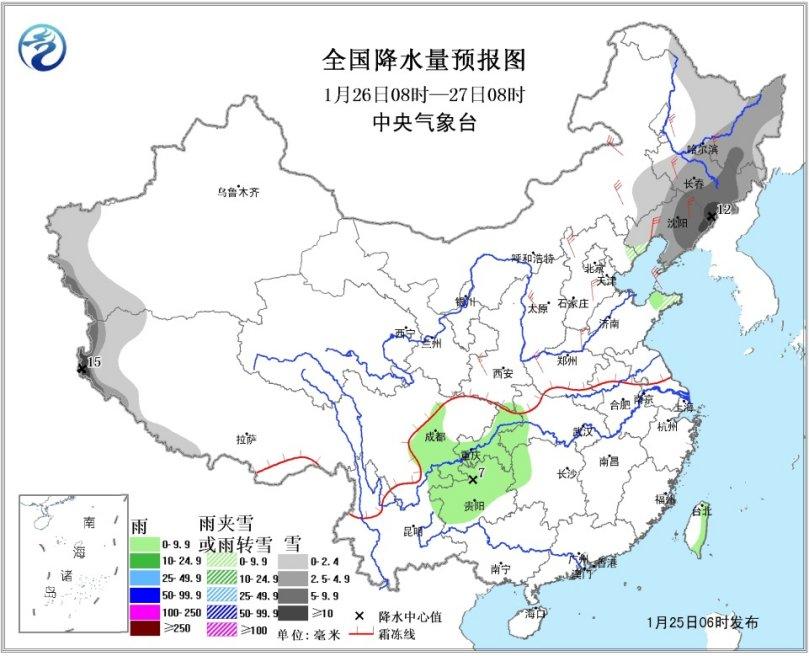 26日08時(shí)至27日08時(shí),新疆西南部、西藏西南部、東北地區(qū)大部等地有小到中雪,局地有大到暴雪;四川盆地西部和南部、重慶、貴州、臺(tái)灣等地有小雨或陣雨(見(jiàn)圖2)。內(nèi)蒙古中東部、西北地區(qū)東部、華北、東北等地的部分地區(qū)有4~6級(jí)風(fēng)。黃海北部部分海域風(fēng)力可達(dá)8級(jí)。