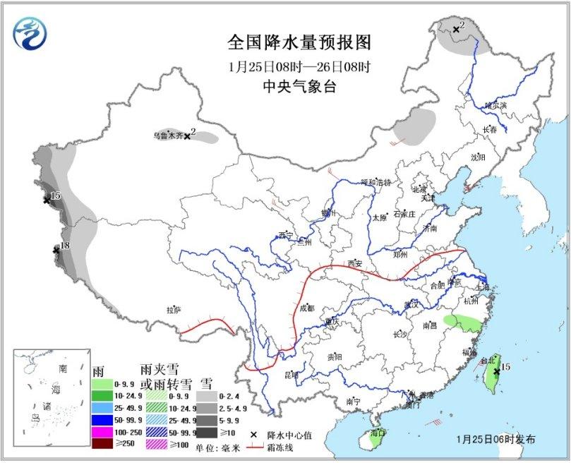 25日08時(shí)至26日08時(shí),新疆西南部、西藏西南部、黑龍江北部等地部分地區(qū)有小到中雪,局地有大到暴雪;海南島東部、臺(tái)灣等地有小到中雨或陣雨(見(jiàn)圖1)。內(nèi)蒙古中西部、甘肅西部等地有4~6級(jí)風(fēng)。