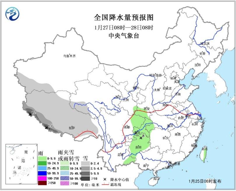 27日08時(shí)至28日08時(shí),新疆西南部、西藏大部等地有小中雪,其中,西藏西南部局地有大到暴雪;陜西南部、四川東北部、重慶、貴州及云南東南部等地有小雨或陣雨(見(jiàn)圖3)。