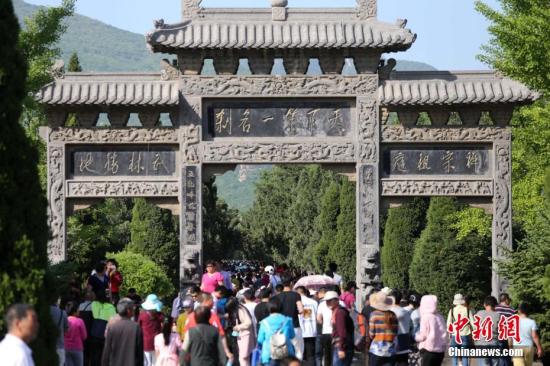 4月30日,“五一”假期第二天,各地迎來客流高峰。圖為游客經(jīng)過李世民親封的“天下第一名剎”牌坊。 王中舉 攝
