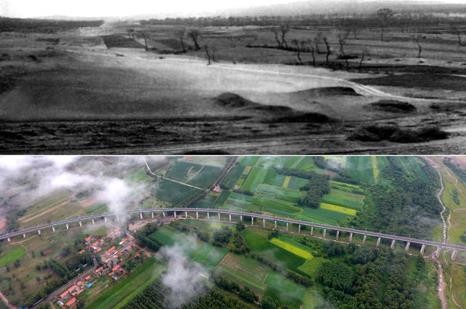 拼版照片:上圖為治理前的山西省右玉縣右衛(wèi)鎮(zhèn)的景象(資料照片);下圖為現(xiàn)在山西省右玉縣右衛(wèi)鎮(zhèn)一帶的景象(圖片來源:新華社)。