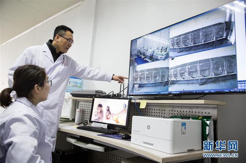 中科院神經(jīng)科學(xué)研究所孫強(qiáng)研究員(左)和劉真博士在育嬰室查看克隆猴“中中”和“華華”的情況