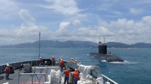 某型拖船對“失事潛艇”進行拖帶