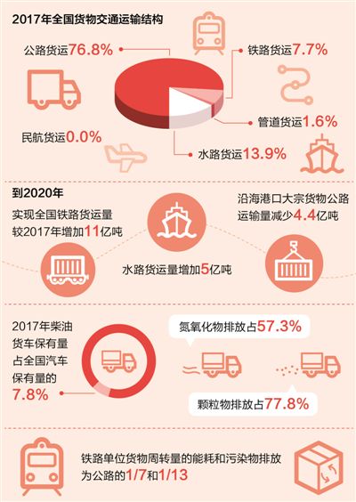 優(yōu)化調(diào)整交通運(yùn)輸結(jié)構(gòu)方面,在7月2日舉行的國務(wù)院政策例行吹風(fēng)會(huì)上,交通運(yùn)輸部有關(guān)負(fù)責(zé)人介紹,以推進(jìn)大宗貨物運(yùn)輸“公轉(zhuǎn)鐵、公轉(zhuǎn)水”為主攻方向,通過三年集中攻堅(jiān),到2020年實(shí)現(xiàn)全國鐵路貨運(yùn)量較2017年增加11億噸、增長30%,水路貨運(yùn)量增加5億噸、增長7.5%,沿海港口大宗貨物公路運(yùn)輸量減少4.4億噸。今年起,在全國范圍實(shí)施鐵路運(yùn)能提升、水運(yùn)系統(tǒng)升級(jí)、公路貨運(yùn)治理、多式聯(lián)運(yùn)提速、信息資源整合、城市綠色配送等六大行動(dòng)。