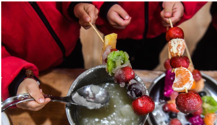 11月21日,孩子們在老師的帶領下用桔子、山楂等水果制作糖葫蘆。