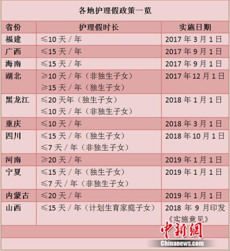 據中新網記者不完全統(tǒng)計,目前至少有福建、廣西、湖北、海南、黑龍江、重慶、四川、河南、寧夏、內蒙古、山西等10余省份出臺了具體規(guī)定。各地的護理假時長有所區(qū)別,此外,在湖北、黑龍江、四川、寧夏等地還規(guī)定,非獨生子女也可享受這一待遇。