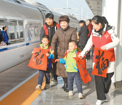在商丘火車站,志愿者把“福”字和春聯(lián)送給站臺上的旅客。 王漢超 王春雷攝影報道 |