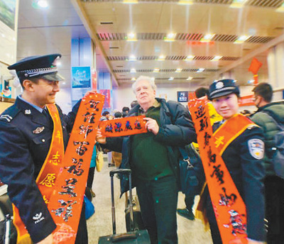 大同鐵路公安處大同車站派出所民警將親手書寫的春聯(lián)送到外國游客手中。 李 曼攝(人民視覺) |