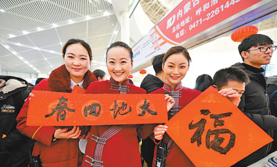 在呼和浩特鐵路東站,乘務(wù)員為旅客送春聯(lián)及“福”字,讓旅客帶著祝福回家。 張 棖 陳立庚攝影報道 |