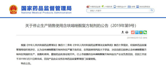 國家藥品監(jiān)督管理局在近期發(fā)布的公告中指出,停止含呋喃唑酮復(fù)方制劑在我國的生產(chǎn)、銷售和使用,撤銷藥品批準(zhǔn)證明文件。已上市銷售的含呋喃唑酮復(fù)方制劑由生產(chǎn)企業(yè)負(fù)責(zé)召回,并于2019年3月31日前完成,召回產(chǎn)品由企業(yè)所在地藥品監(jiān)督管理部門監(jiān)督銷毀。