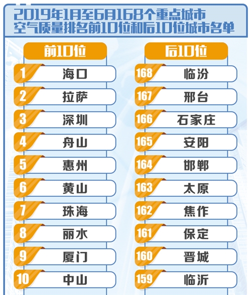 從重點城市空氣質(zhì)量排名看,上半年168個重點城市中,臨汾、邢臺、石家莊市等20個城市空氣質(zhì)量相對較差;??凇⒗_、深圳市等20個城市空氣質(zhì)量相對較好。