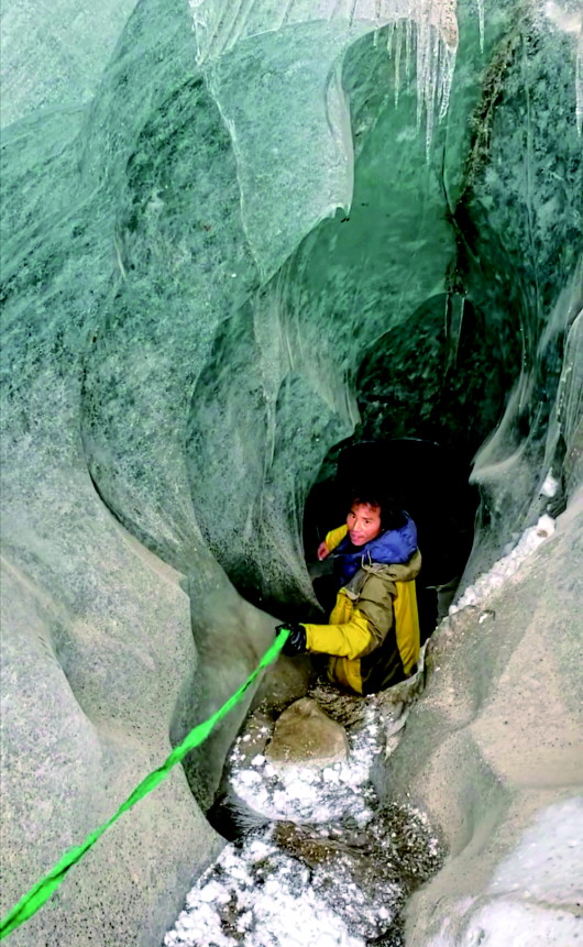 王相軍發(fā)布的視頻截圖,此時(shí)他正在進(jìn)入一條冰川的內(nèi)部。(圖片由受訪者提供)