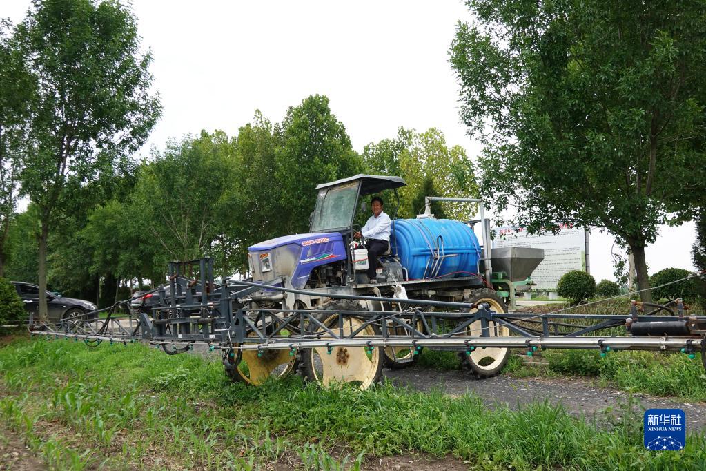 7月7日,安徽省蚌埠市懷遠(yuǎn)縣種糧大戶尚躍駕駛大型植保機在田間噴灑農(nóng)藥。新華社發(fā)