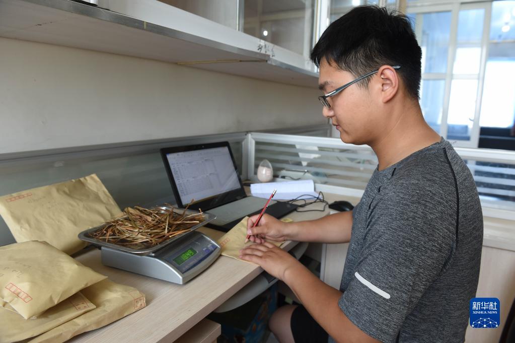 在安徽省阜陽市太和縣舊縣鎮(zhèn),徐旭東在實驗室對農(nóng)作物樣品進(jìn)行稱重和記錄(6月28日攝)。新華社記者 周牧 攝
